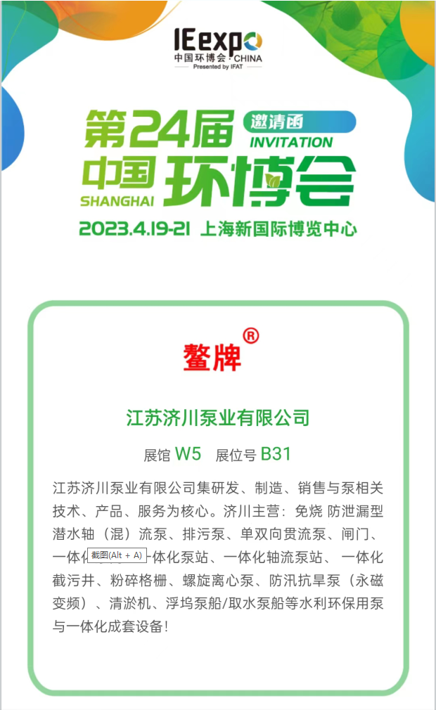 4月19-21日誠(chéng)邀您蒞臨23年上海環(huán)博... 4月19-21日江蘇濟(jì)川泵業(yè)誠(chéng)邀您蒞臨23年第24屆中國(guó)環(huán)博會(huì) 展館W5 展位號(hào)B31...